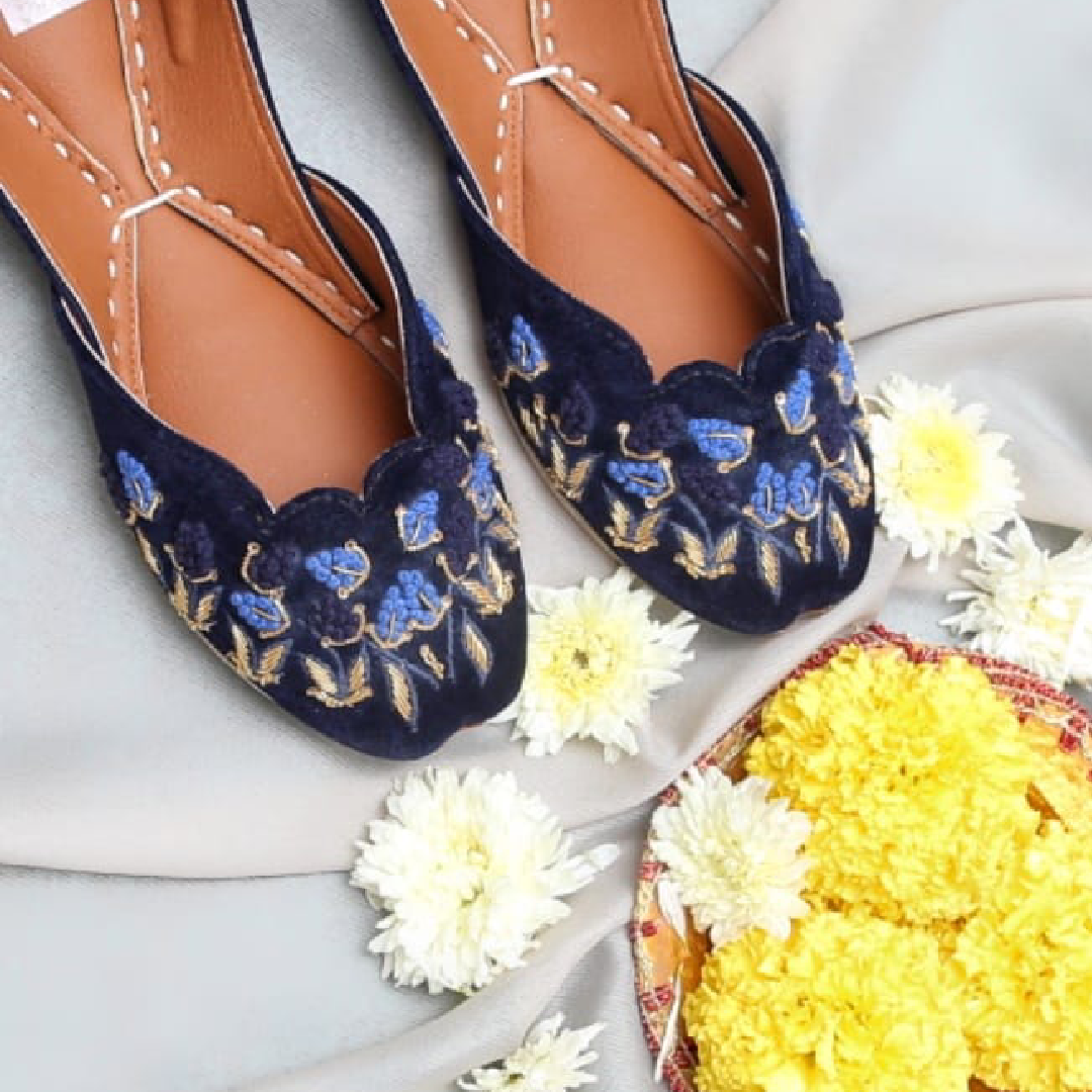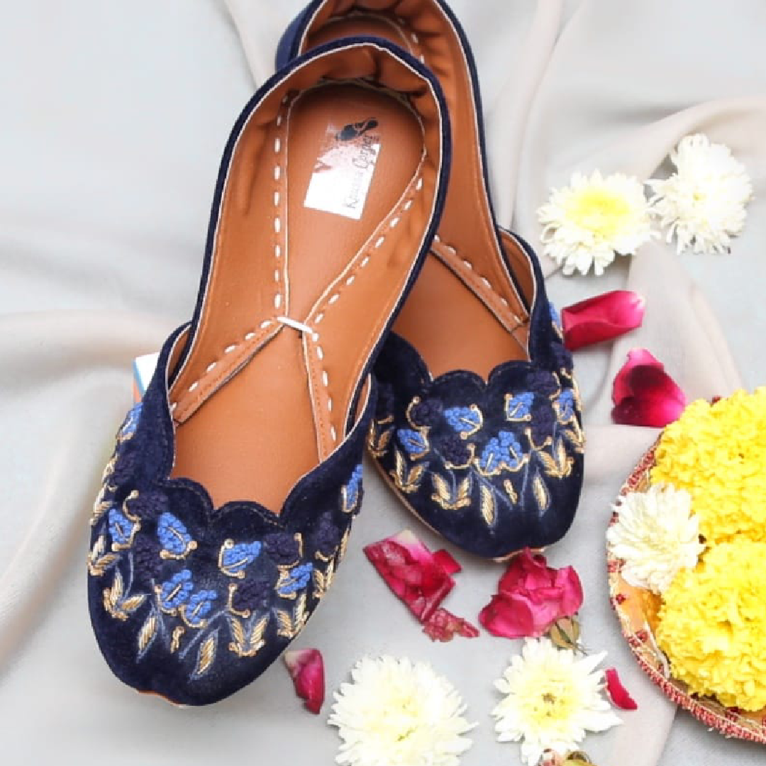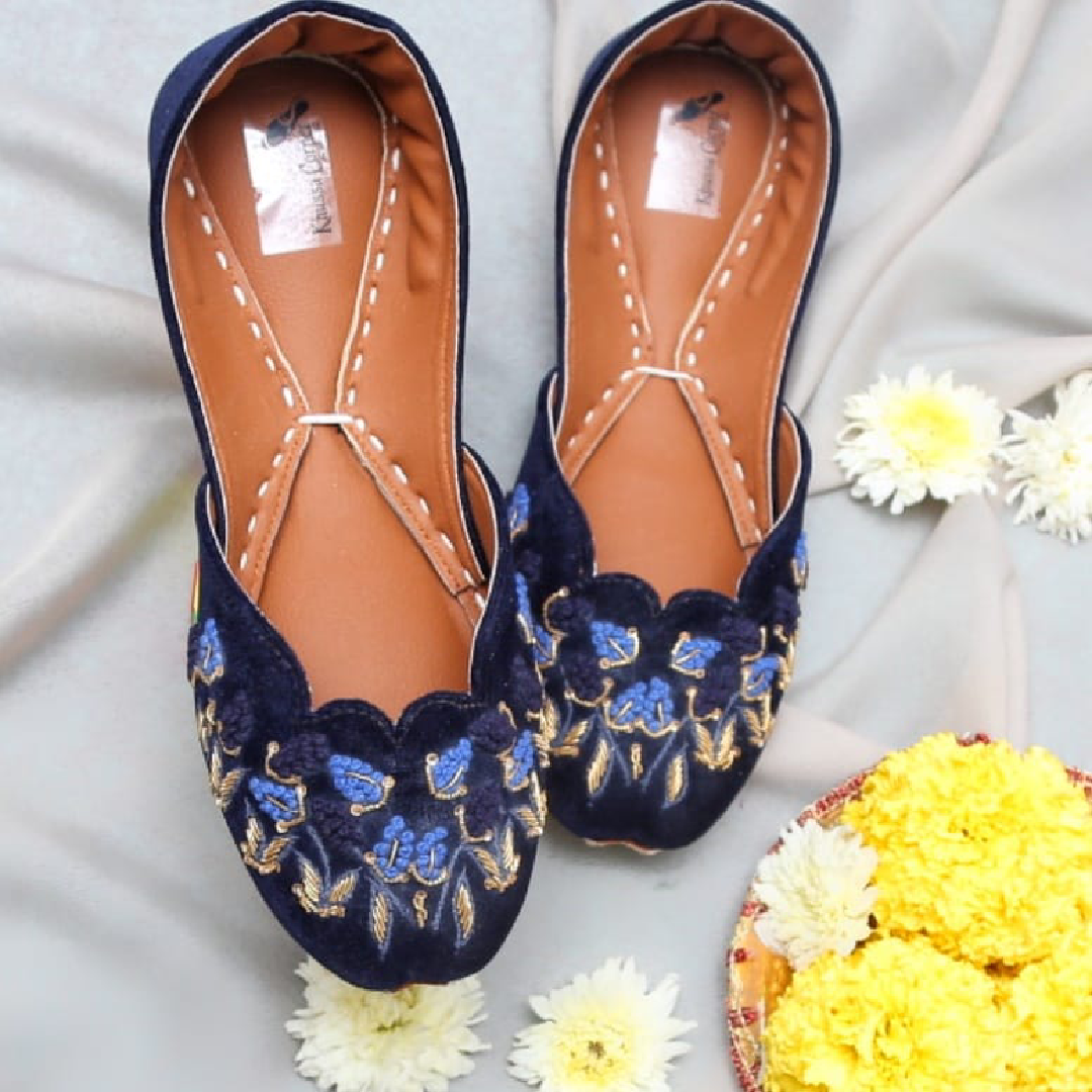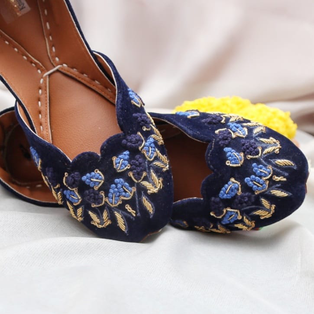 The navy blue velvet khussa having a scalloped neckline and hand-stitched threaded small balls in a combination of light and dark blue. Additionally, it features golden cora work to enhance its overall look. This detailing suggests a carefully crafted and stylish design, making it a visually appealing option for those seeking an elegant and unique pair of khussas.