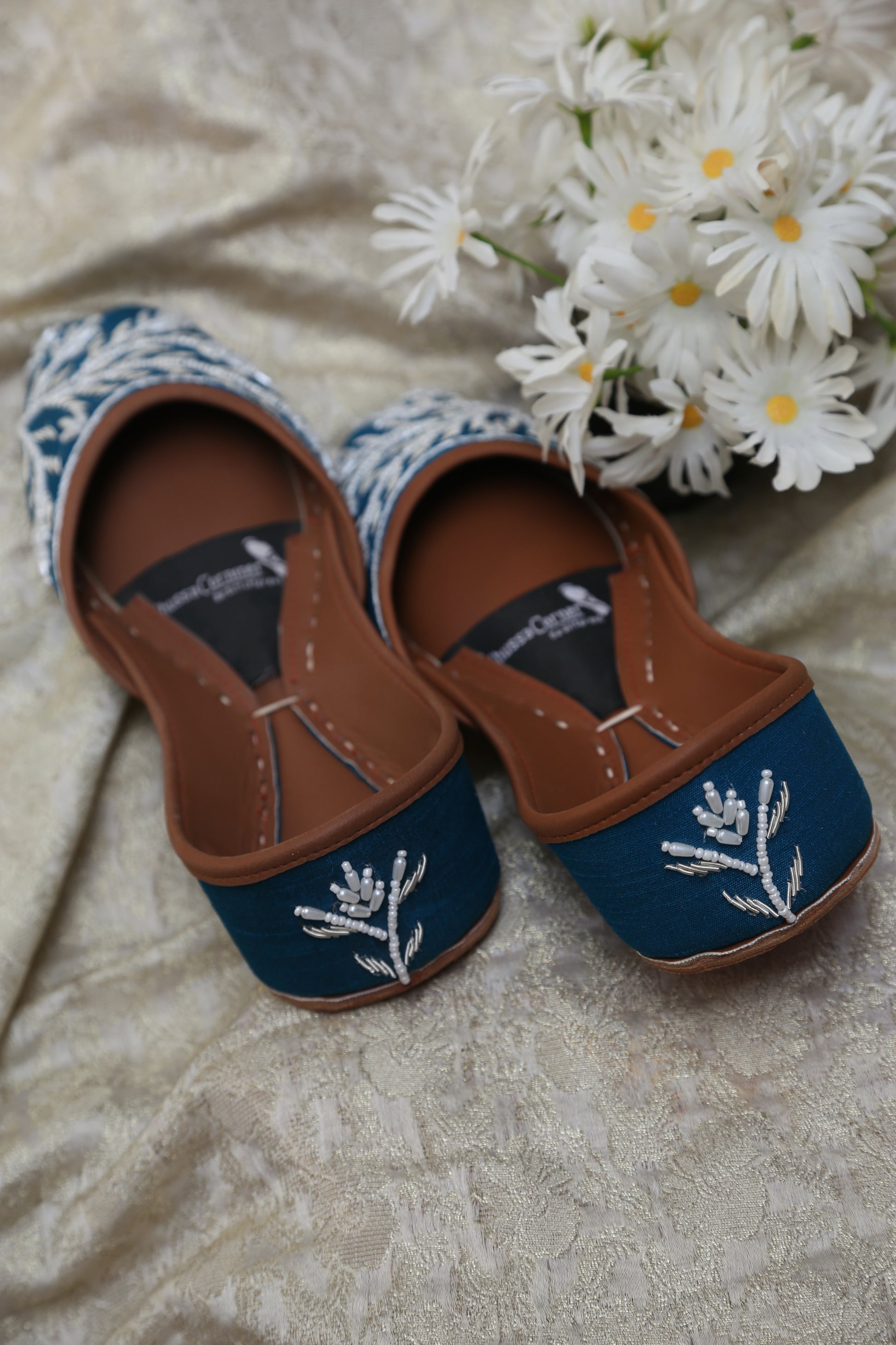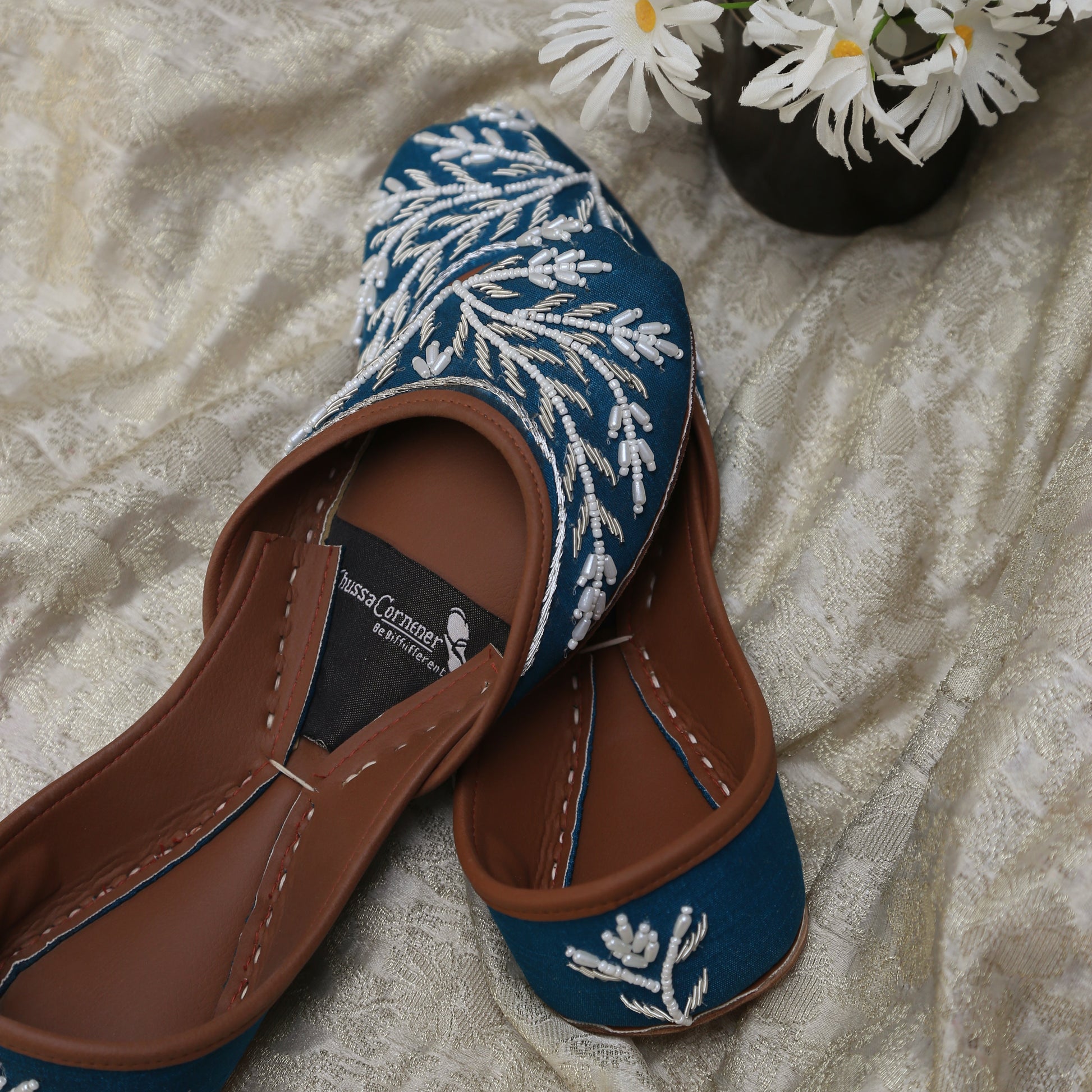Delicate like morning dew and detailed like heirloom art, Aab-e-Gul Khussa Featuring intricate hand embroidery with fine beads and zari threads, this design blooms beautifully on a rich base, creating a timeless festive silhouette.