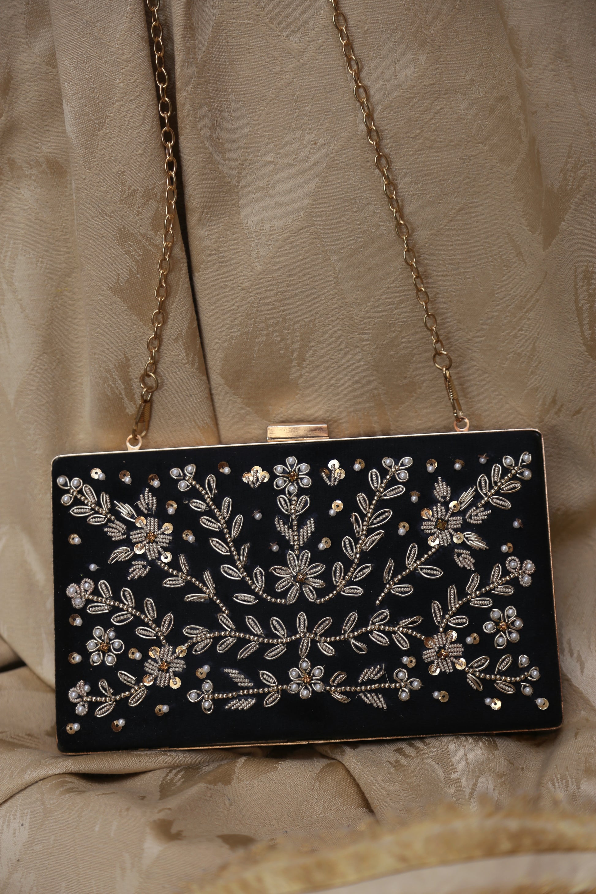 Crafted on rich velvet in classic black, this rectangular clutch embodies understated luxury. Each vine and floral motif is hand-embroidered using fine zari, pearls, and sequin accents, creating a shimmering masterpiece that reflects light beautifully.