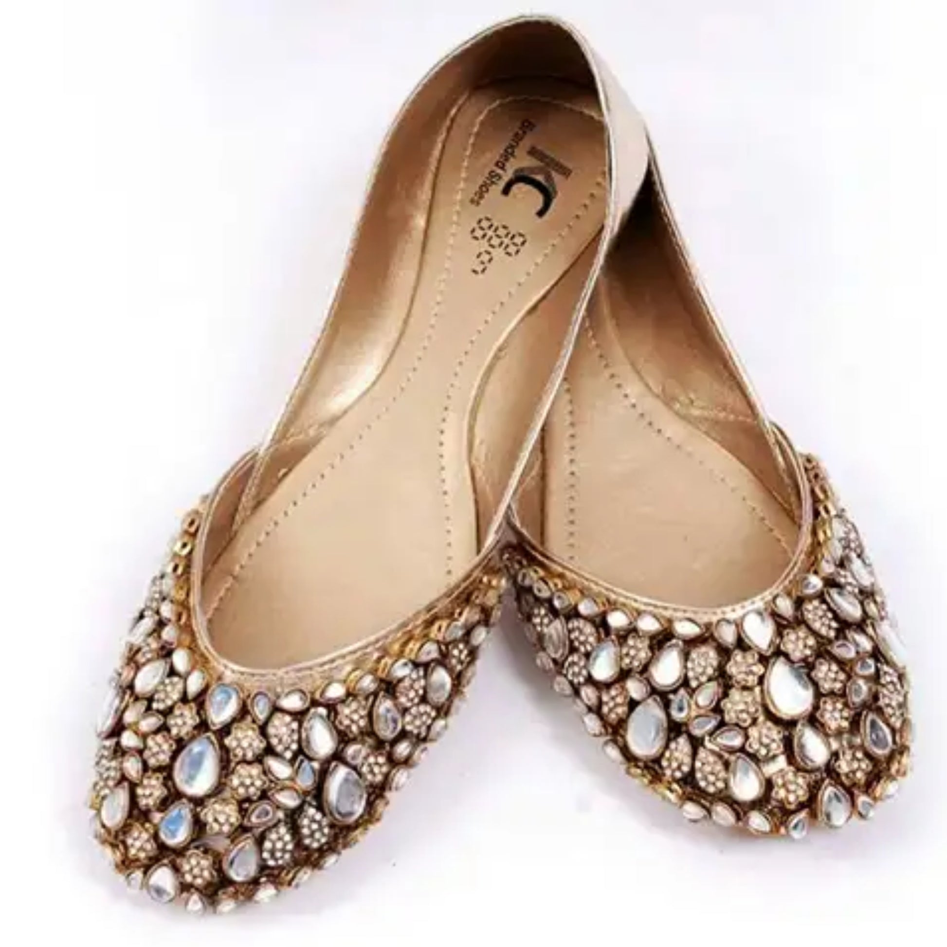The luxurious leather kundan khussa with a champagne gold base is a glamorous addition to your collection. Originating from the famous Anarkali market of Lahore, it embodies cultural richness. Intended for special occasions, this khussa is designed to provide a luxurious and regal touch to your styling, making it a standout accessory for festive and celebratory events.
