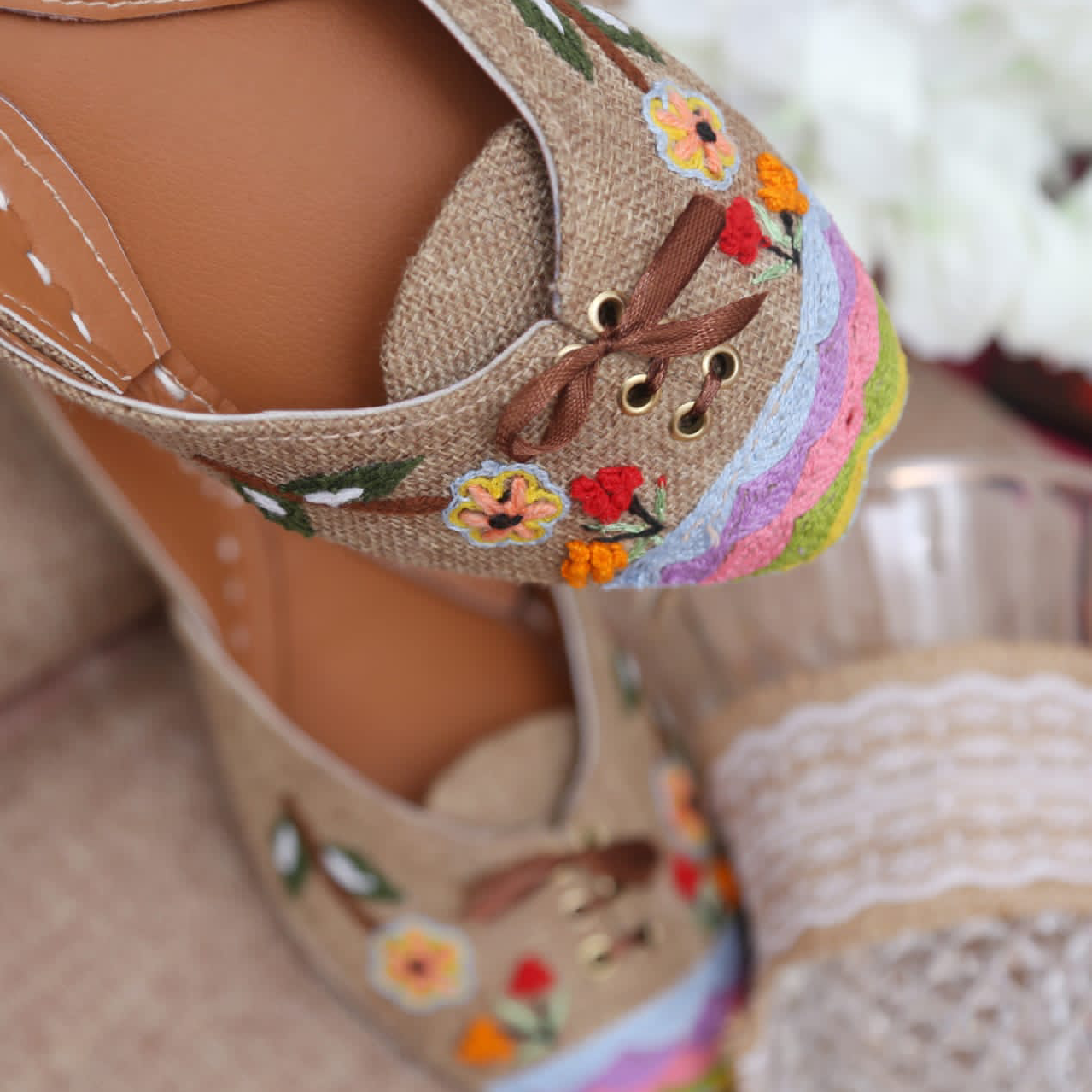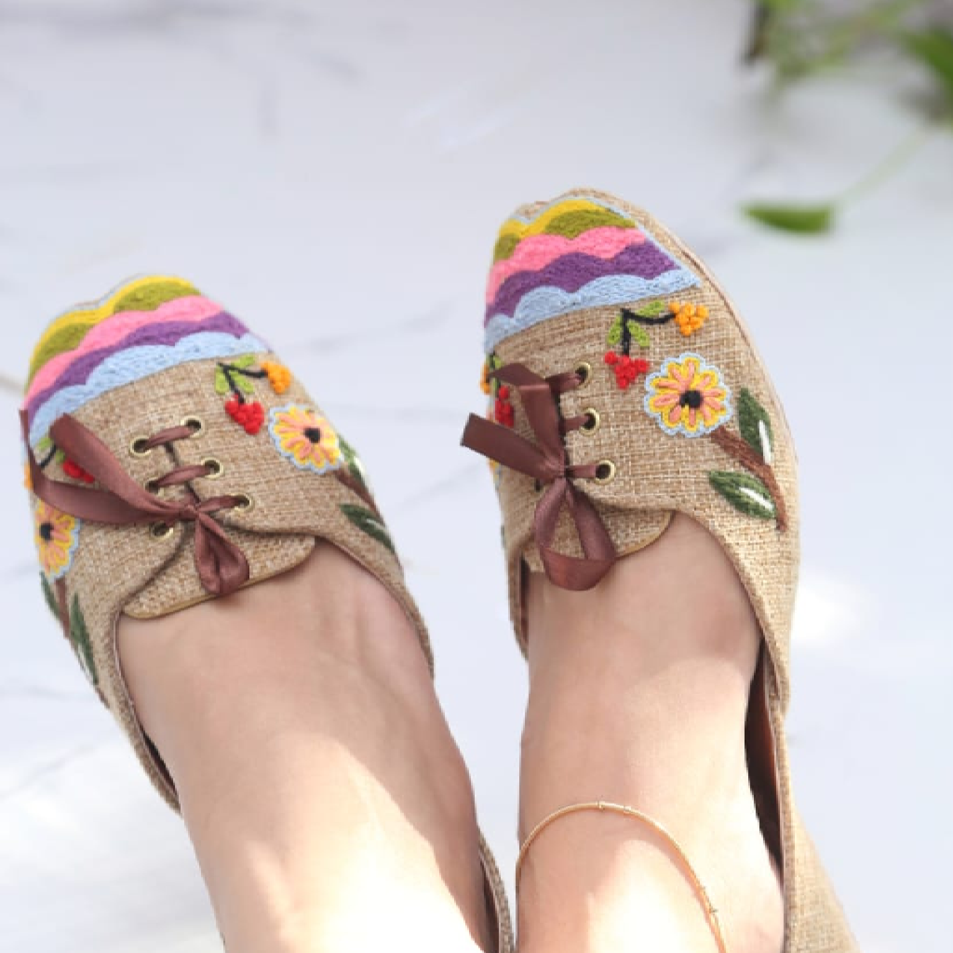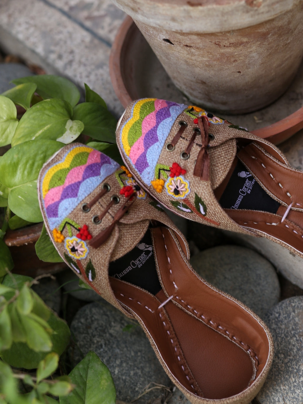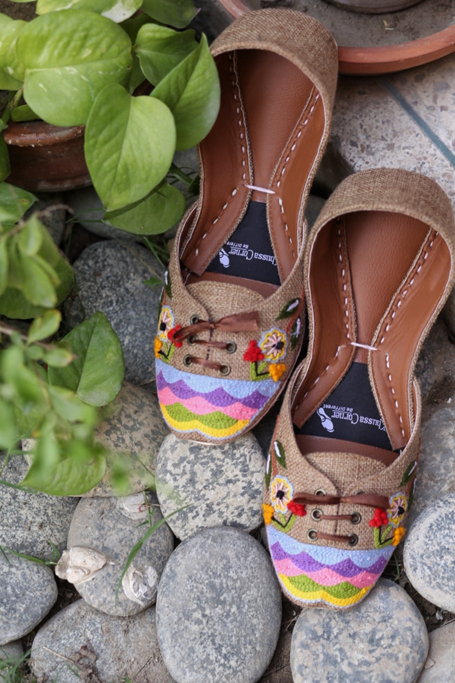 The multicolored hand-embroidered khussa shoes with a jute base and brown lace are characterized by their vibrant and diverse color palette. The incorporation of natural materials like jute, along with the addition of a brown lace, contributes to the overall aesthetic. With its vibrant, chic, and seasonally versatile design, this khussa offers a stylish and colorful option for various occasions.