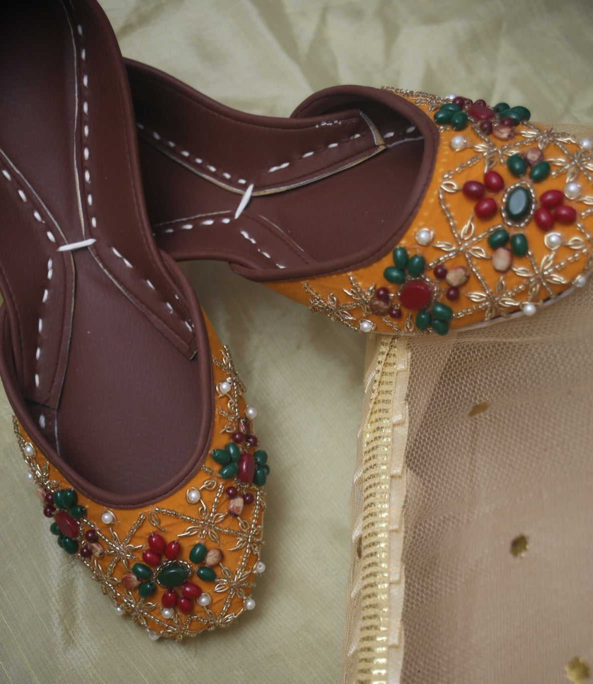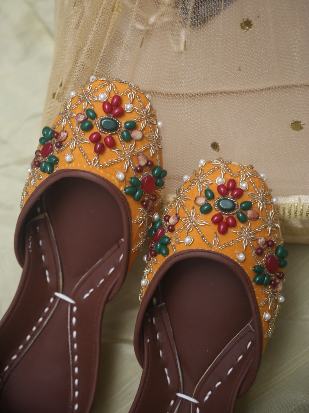 "Hani" is described as being designed specifically for festive occasions, indicating that it complements traditional and celebratory outfits. This mojari features hand embroidery using cora (small beads), stones, and beads. It is presented as a festive mojari that combines vibrant colors, intricate hand embroidery, and heavy work, making it an ideal choice for those looking to enhance their festive attire with a stylish and culturally inspired footwear option.
