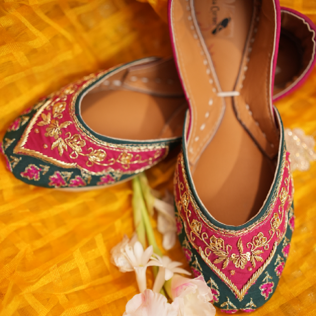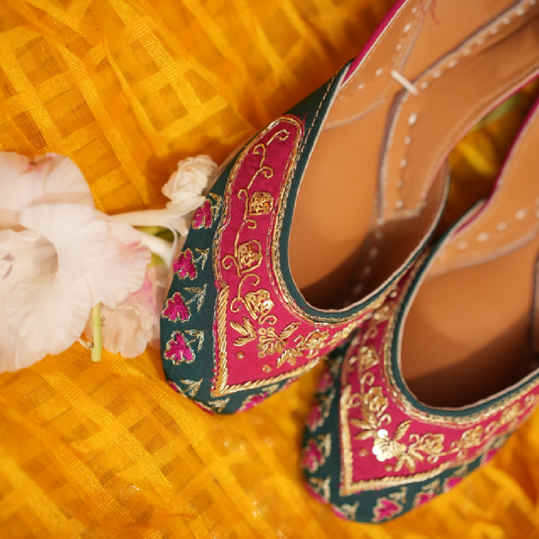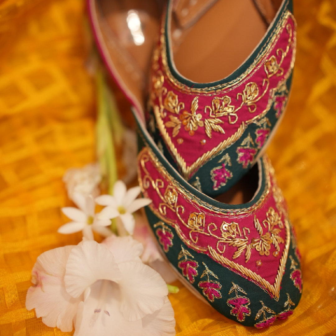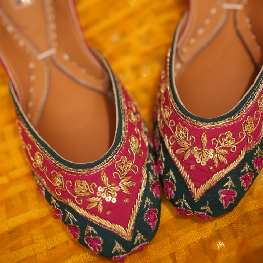 The fusion of old-world charm and modern aesthetics is showcased in this jutti with a traditional combination of pink and orange. The intricate details include touches of gold zari, Sitara, dabka, and pink beads, creating a beautiful and harmonious design. Not only is it visually appealing, but it's also designed for maximum comfort, allowing you to wear it all day long with ease. This jutti represents a perfect blend of tradition and contemporary style.