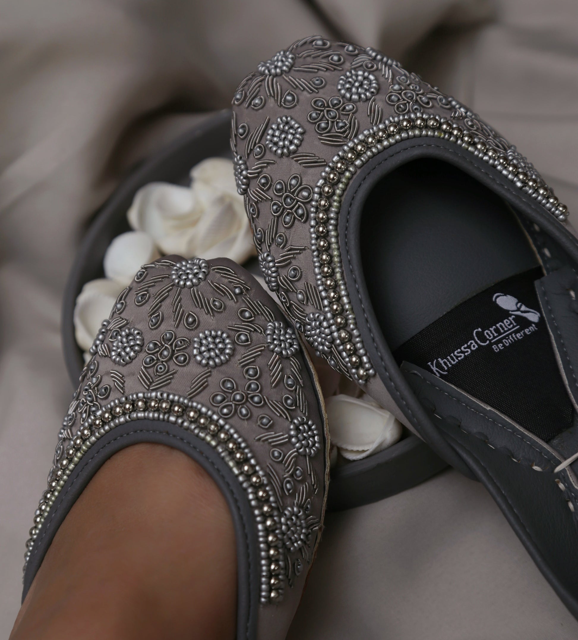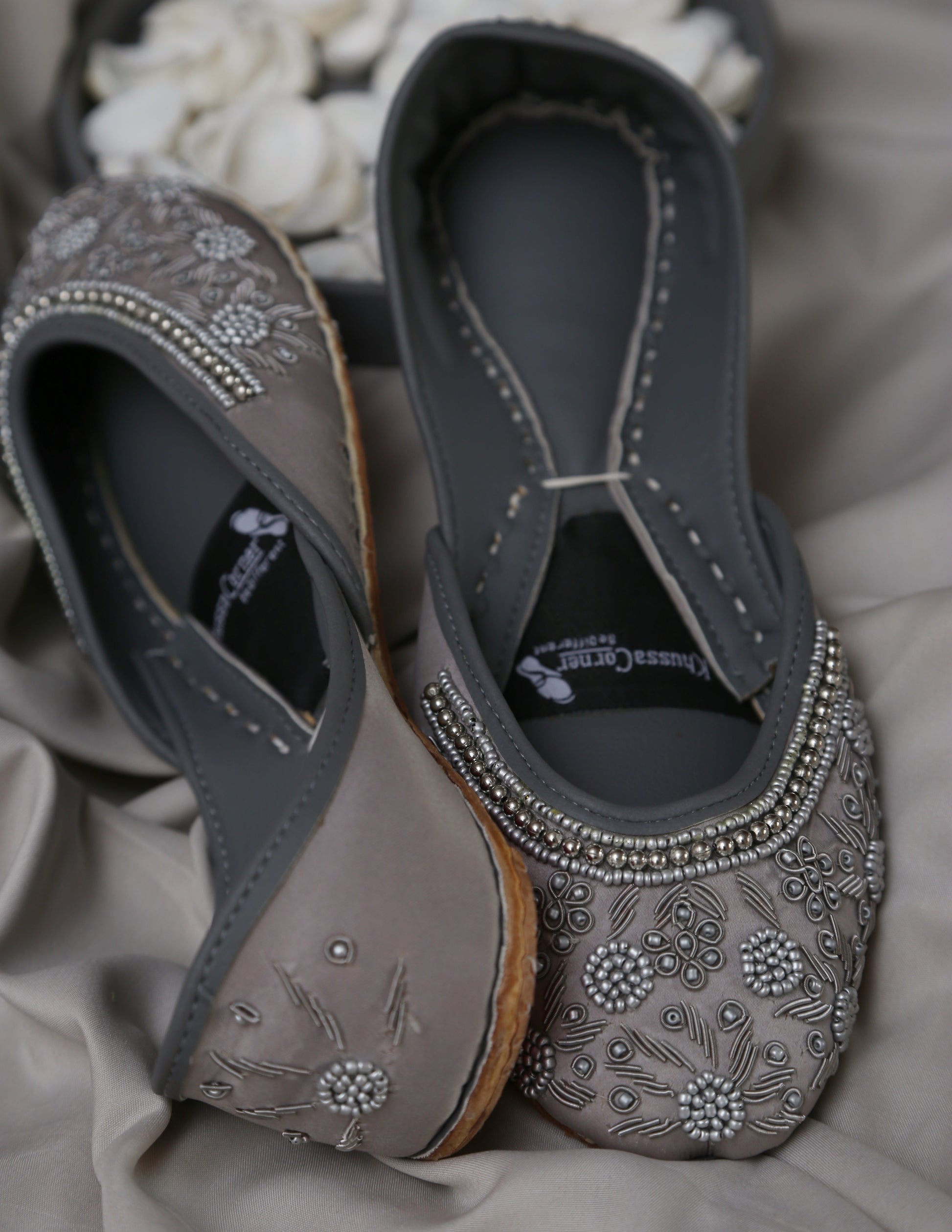 Crafted on a luxurious dove-grey silk base, this pair features breathtaking silver Cora work, precision bead detailing, and floral patterns that shimmer softly under light.