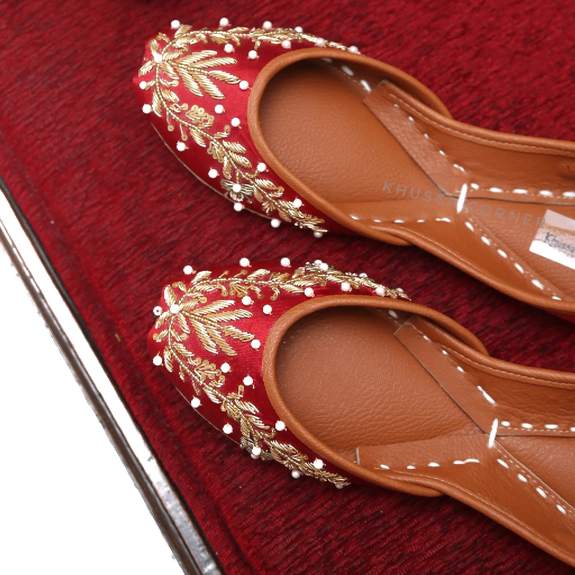Elevate your bridal look with these traditional and detailed khussas! Adorned with golden dabka embroidery on a vibrant red silk base, these khussas are designed to add a touch of regal elegance to your wedding attire. The soft cushion padding ensures comfort, making them the perfect choice for a bride on her special day. Walk down the aisle with grace and style, as these khussas enhance the beauty of your bridal ensemble with their intricate craftsmanship and rich color combination.