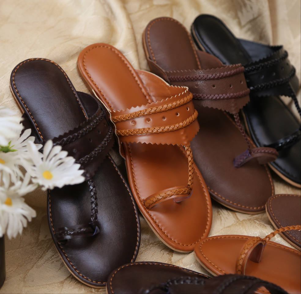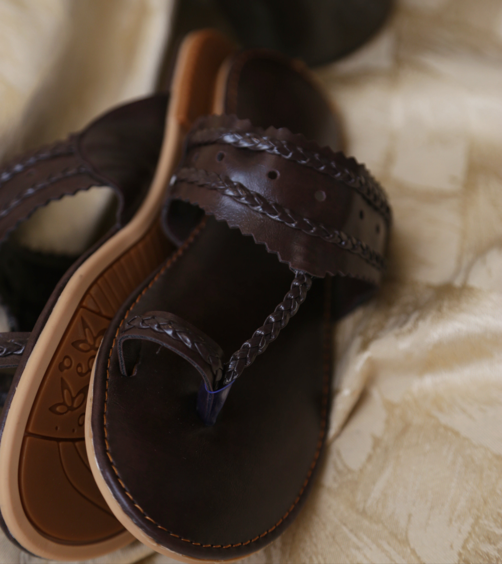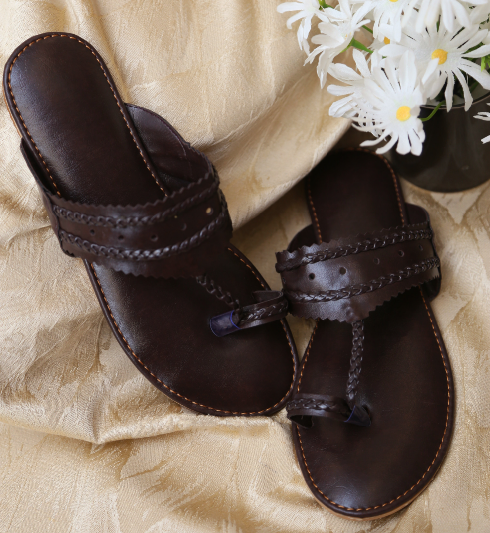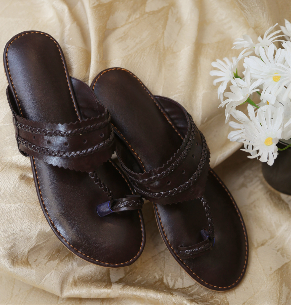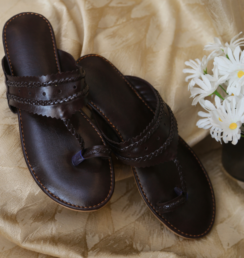 Carry tradition into every step with Meeras, a modern twist on the timeless Kolhapuri. Crafted in a rich choco Brown faux leather, this design features braided straps, scallop detailing, and precise stitching that make it both minimal and refined.