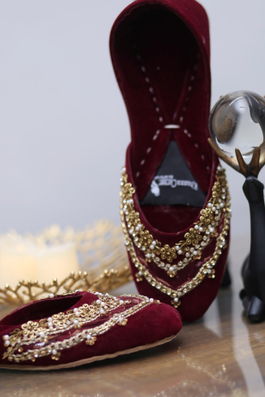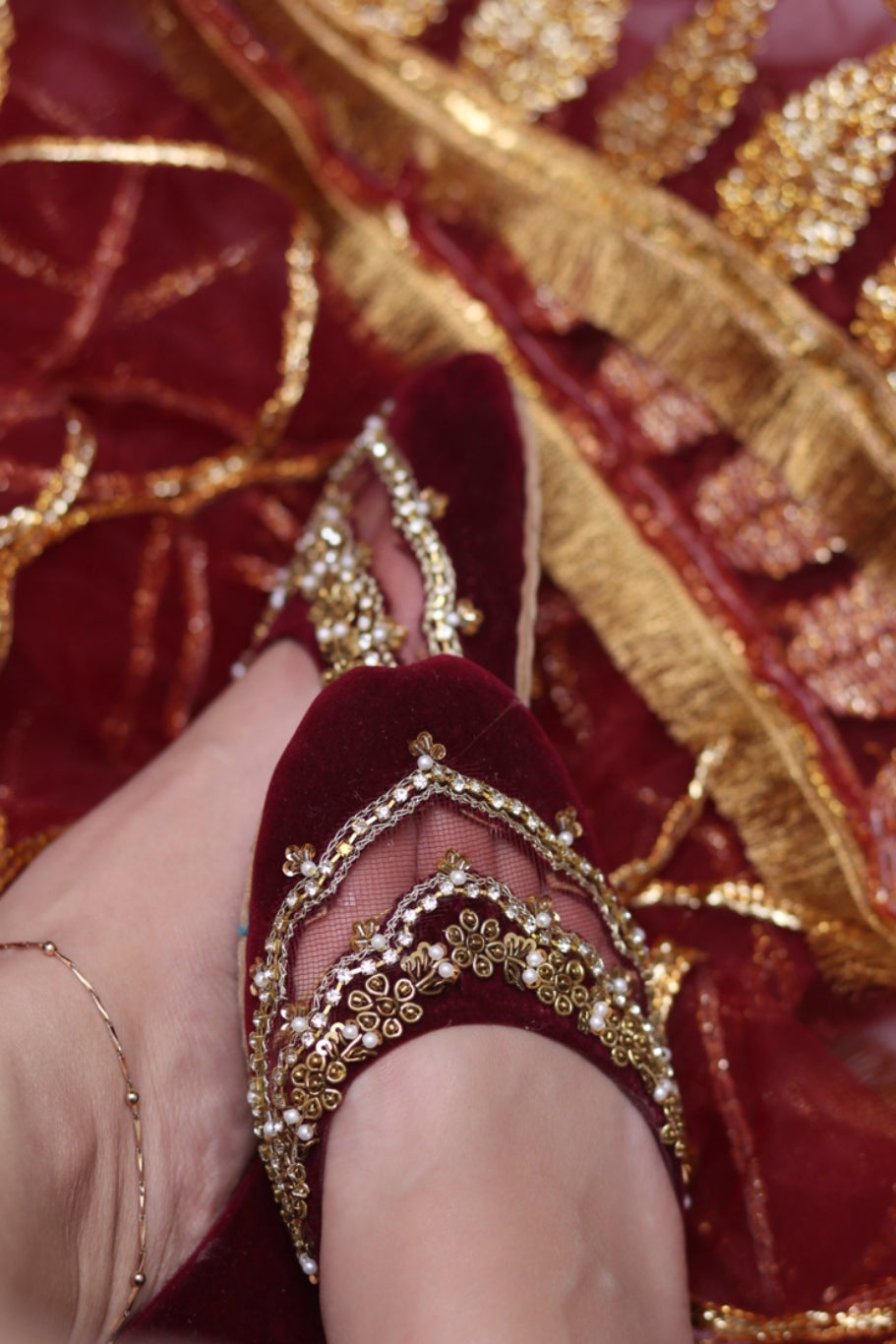 Rani, Maroon velvet based luxurious embroidered Jutti, is a celebration of heritage and sophistication, timeless elegance, vibrant designs and unmatched comfort. This Jutti is very comfortable that you wouldn't want to take them off & the net scallop detailing make it a must have in your wardrobe!