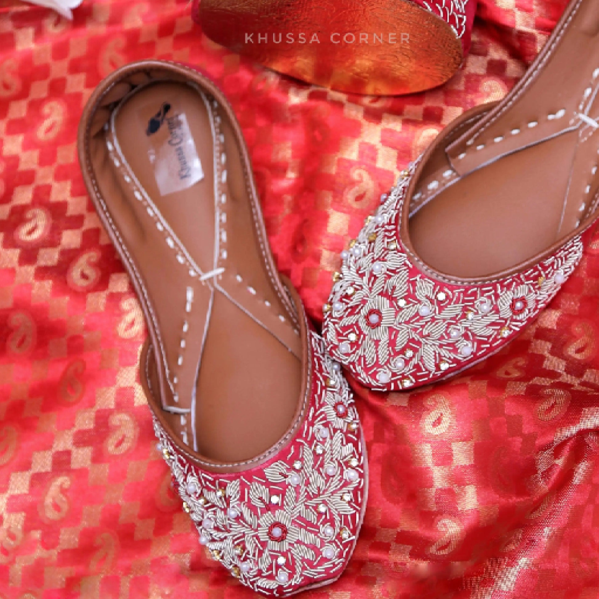 A beautiful red base khussa adorned with full silver dabka embroidery, showcasing a stunning shine. This khussa is crafted with meticulous hand embroidery and hand stitching on leather, adding a touch of luxury and traditional elegance. The combination of vibrant red and radiant silver creates a visually appealing and festive design, making it a perfect choice for special occasions and celebrations.