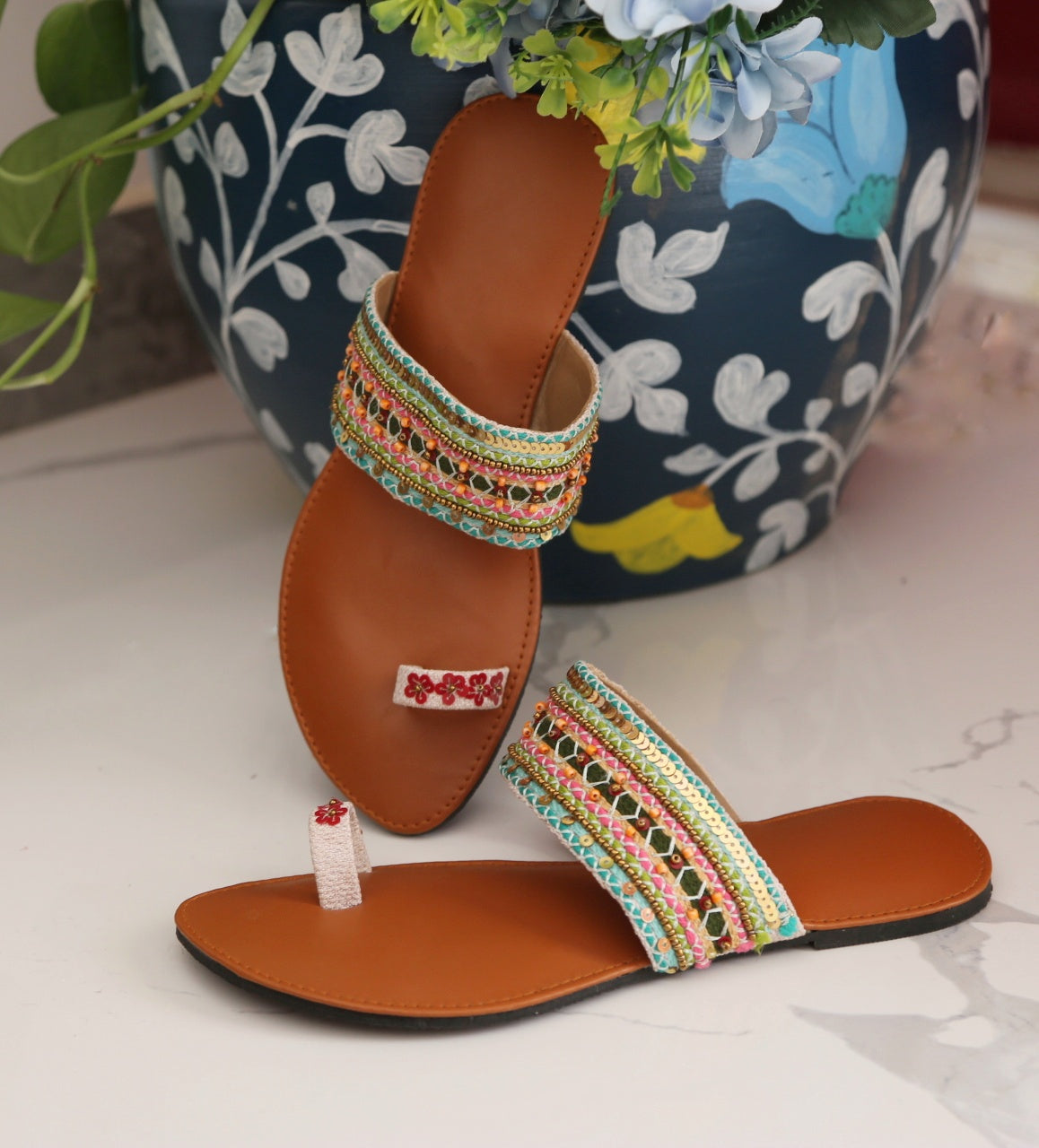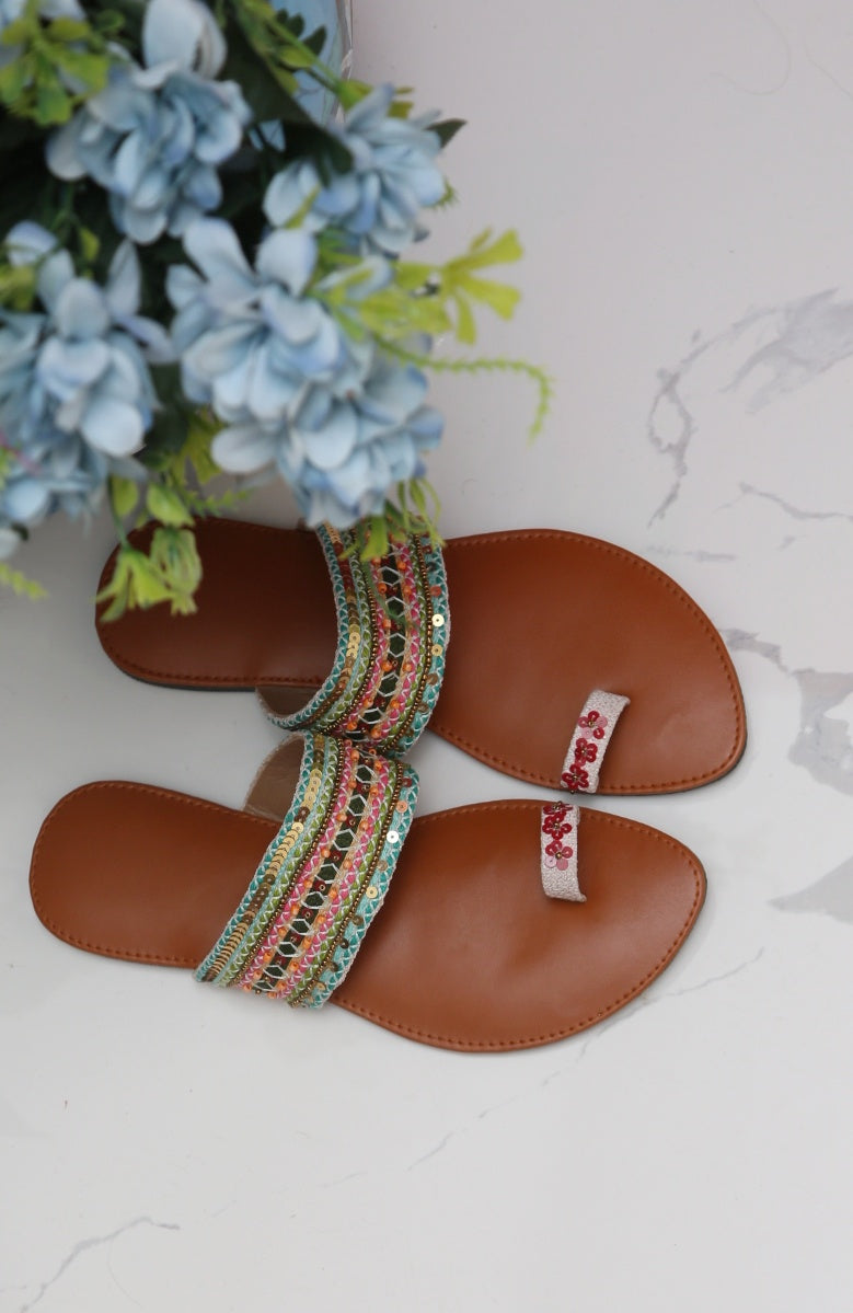 The "Sehar Angez" multi-colored hand-embroidered Kolapuri as a masterpiece. These kolapori feature intricate hand embroidery with sequins and beads, adding a touch of elegance and glamour. The description emphasizes that these Kolapuri are perfect for any look, ensuring both style and comfort.