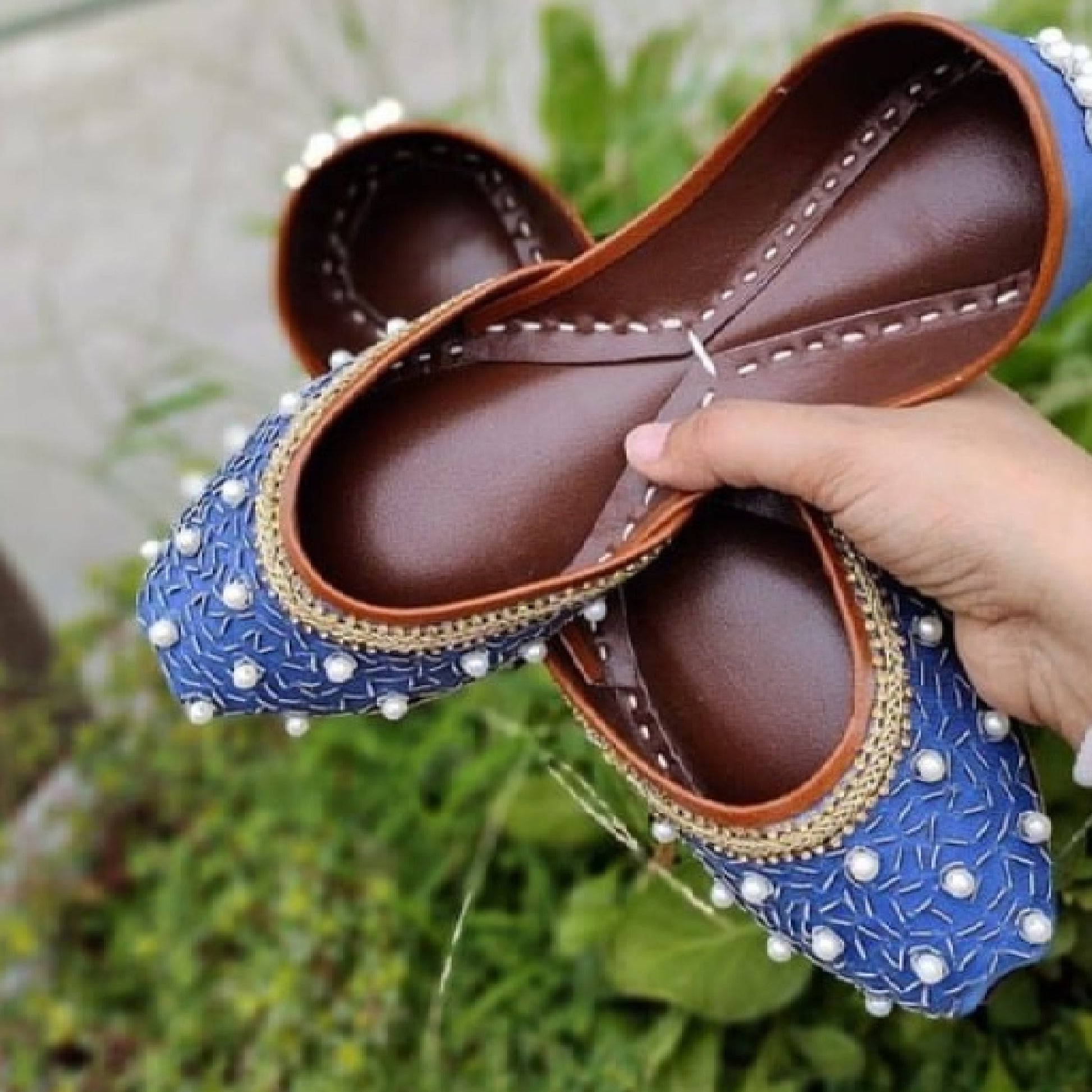 This khussa is described as beautiful, featuring silver cut daana embellishments with white pearls on a blue base. The description encourages potential customers to grab this stylish khussa design, indicating that it's a fashionable and attractive choice for those looking for unique and eye-catching footwear.