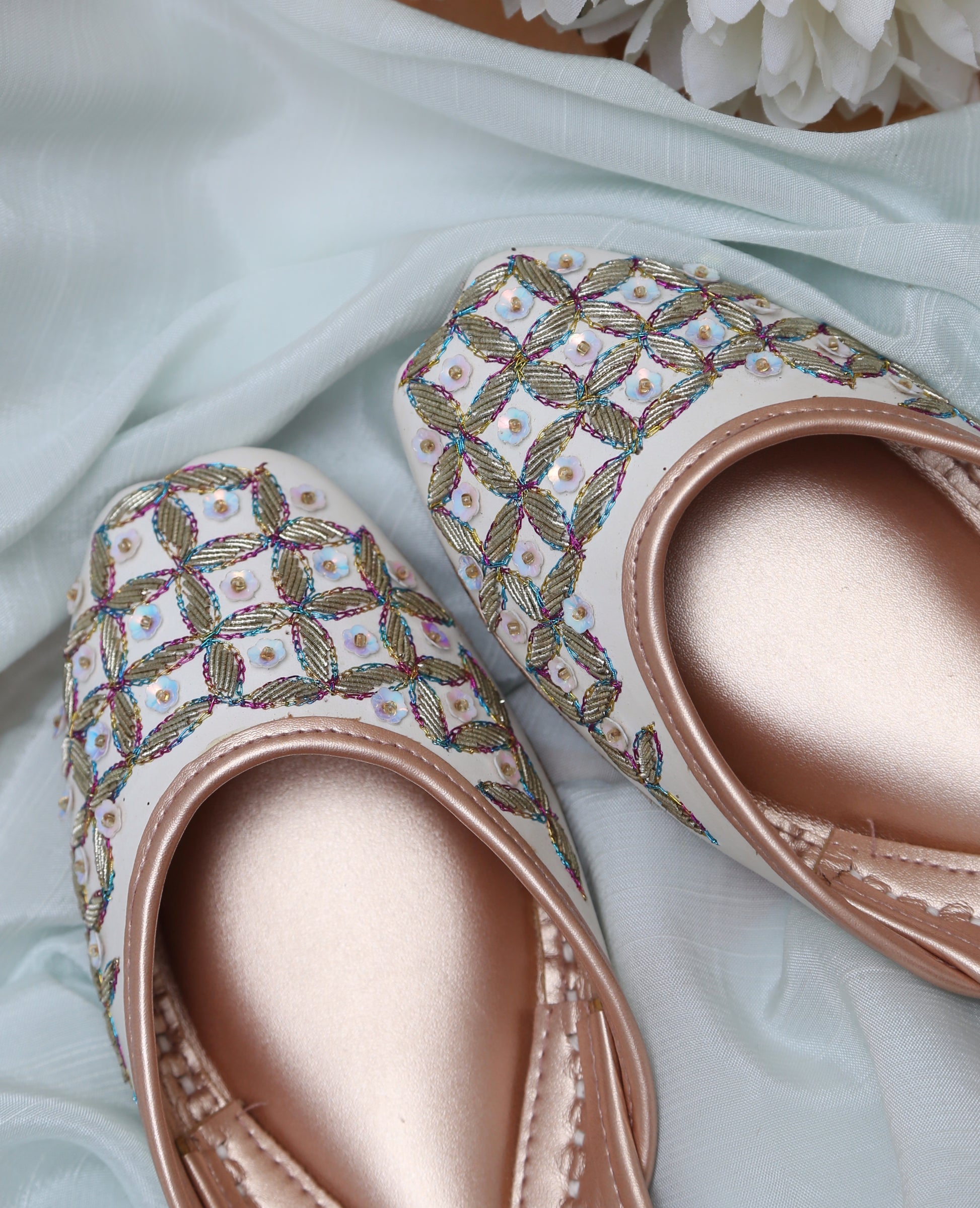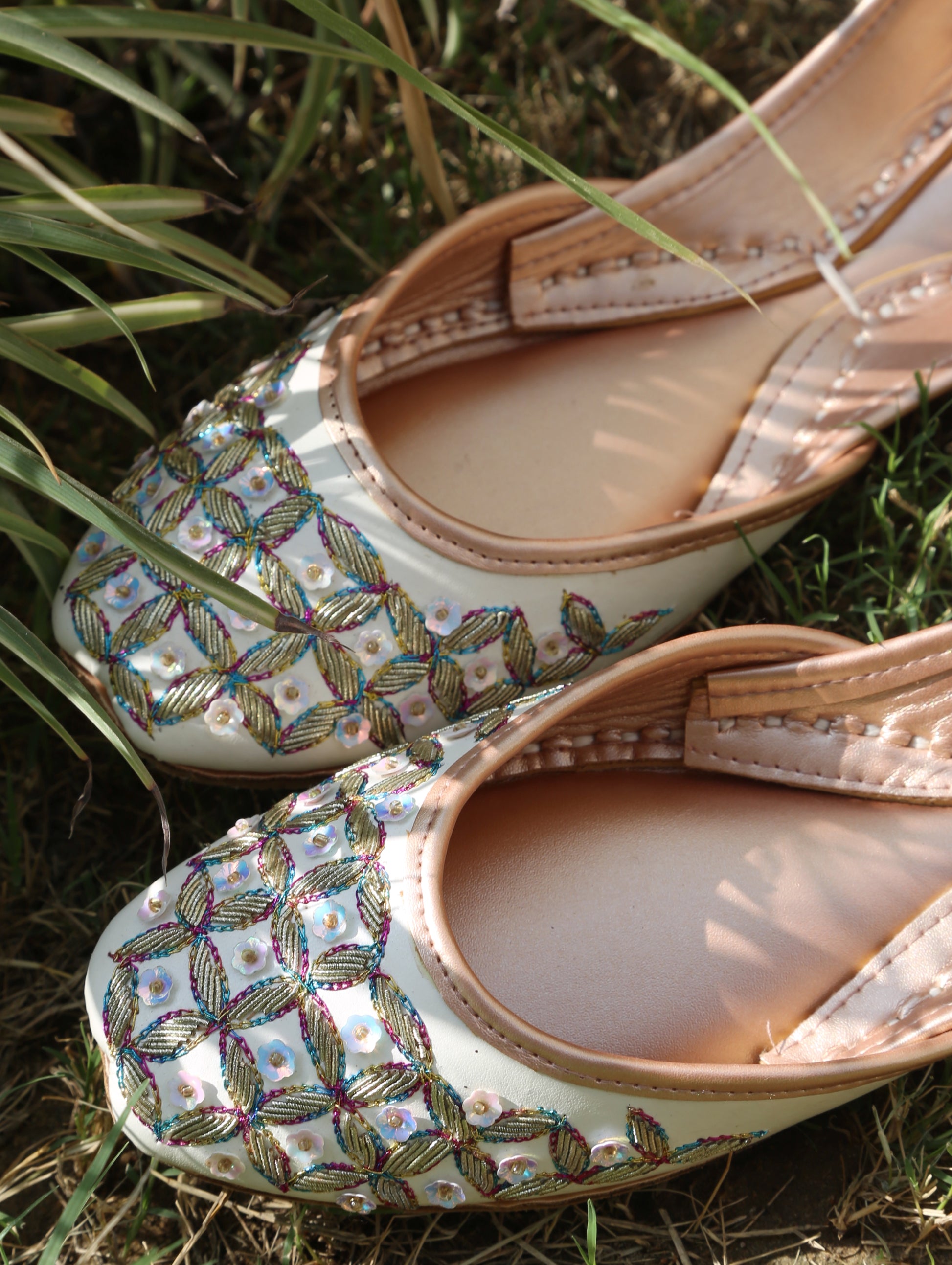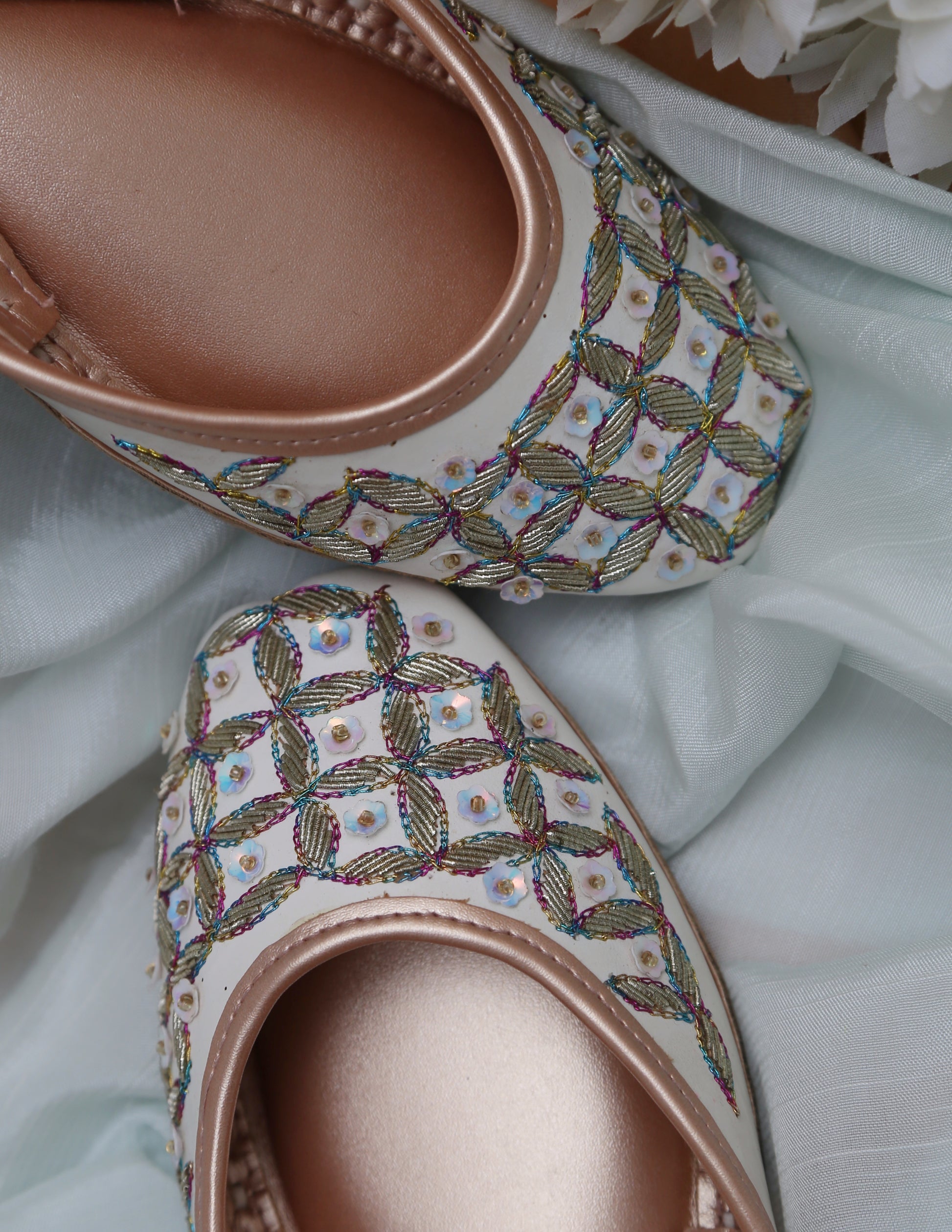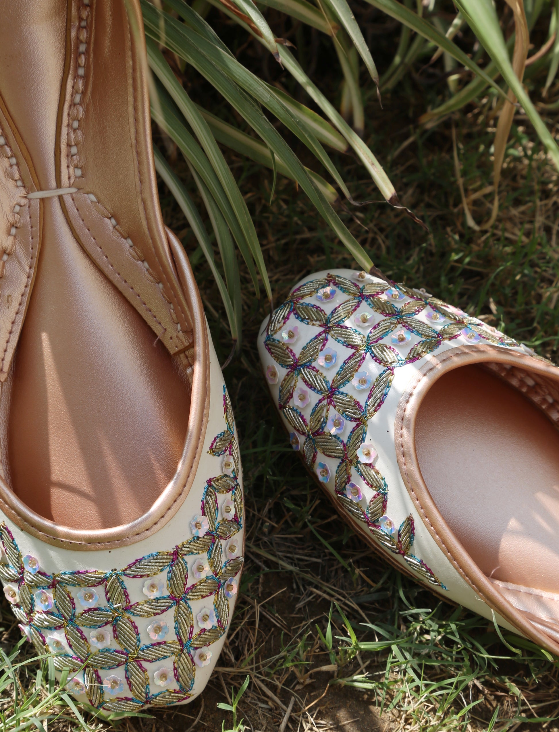 Radiate elegance with every step in our "Ujala" Juttis, Handcrafted with a criss cross pattern on white rexine base with golden embroidery and multi zari, adorned with white small flowers and finished with a charming glass beads on top. These beauties bring bohemian chic to any of your festive outfit. These shoes are perfect fit for those who appreciate unique style and quality craftsmanship.