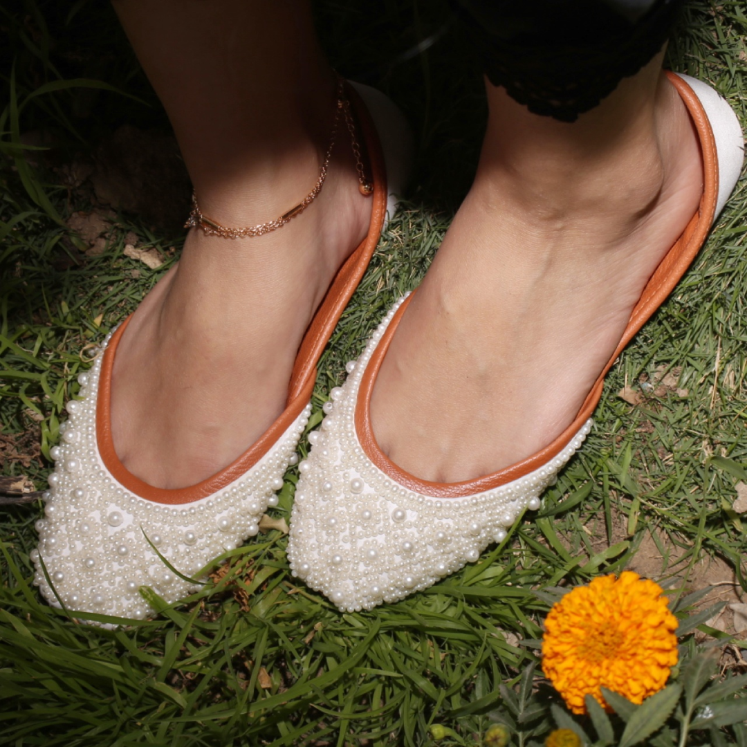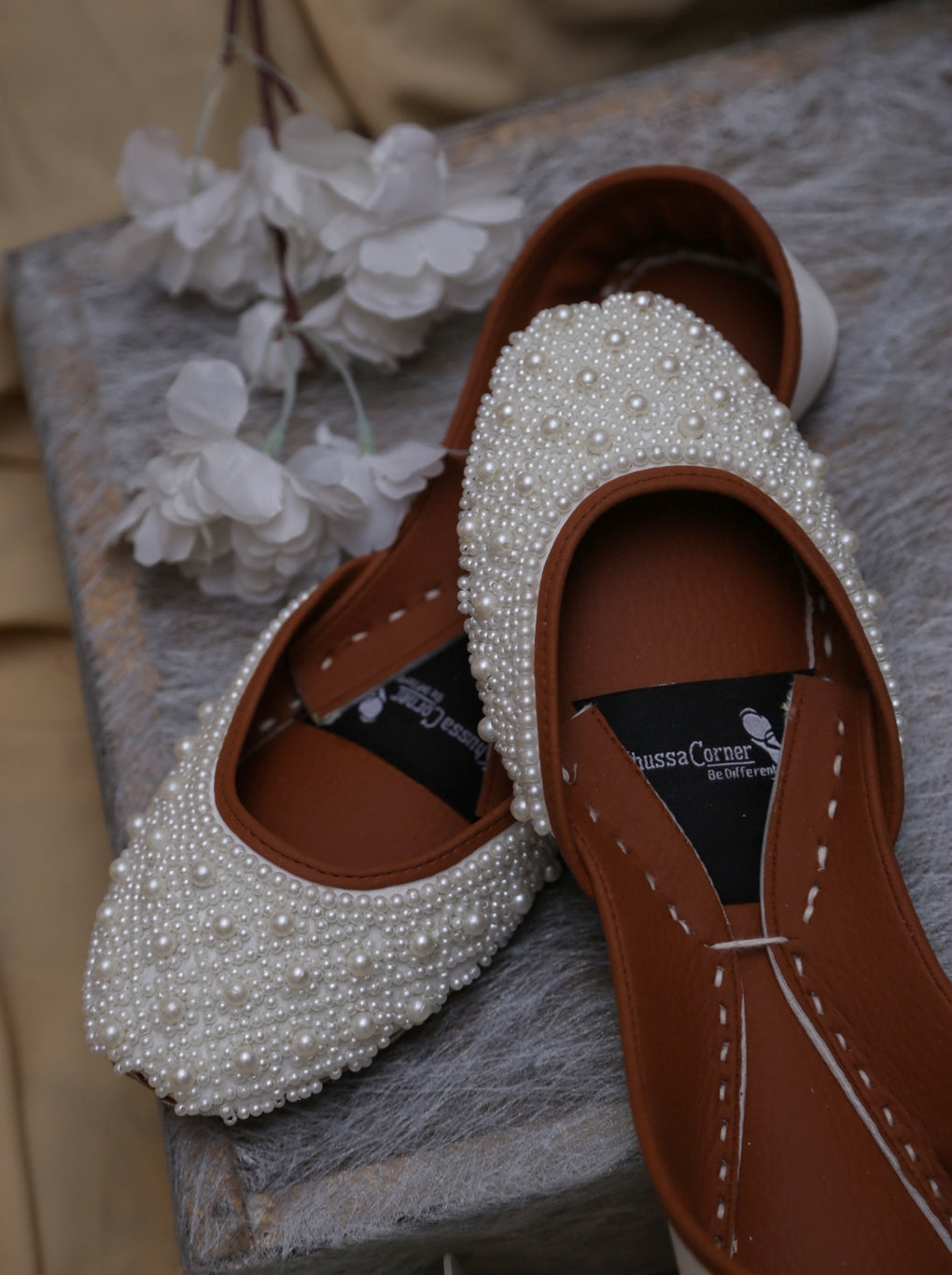 Elevate your style with our alluring "Pure White Pearl" khussa. This masterfully crafted pair features a pure white base adorned with pearls in a special pattern. The meticulous detailing adds a touch of elegance, making it a versatile choice for various occasions, including weddings and parties. Step into sophistication and make a fashion statement with this exquisite pair that combines traditional charm with modern flair.