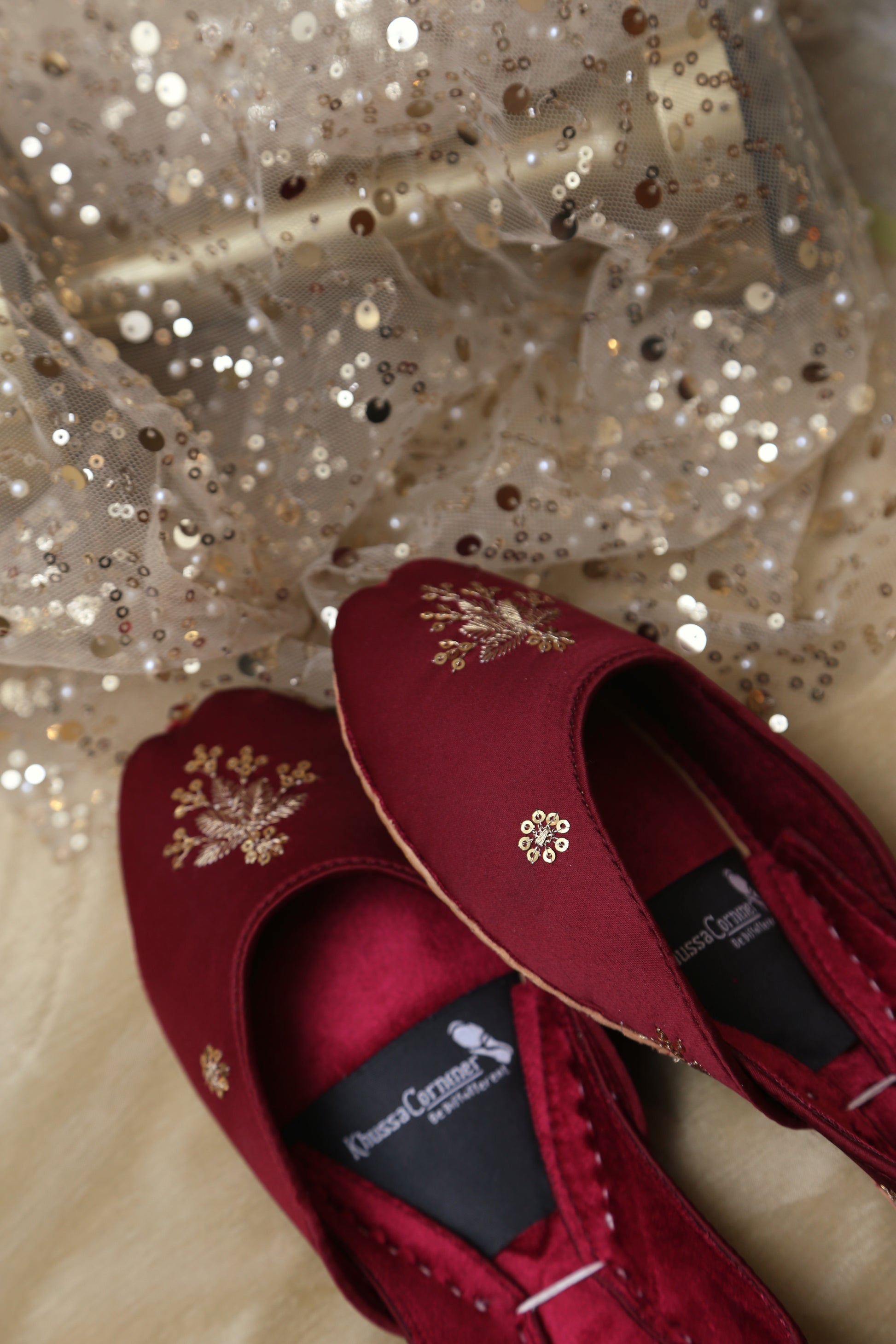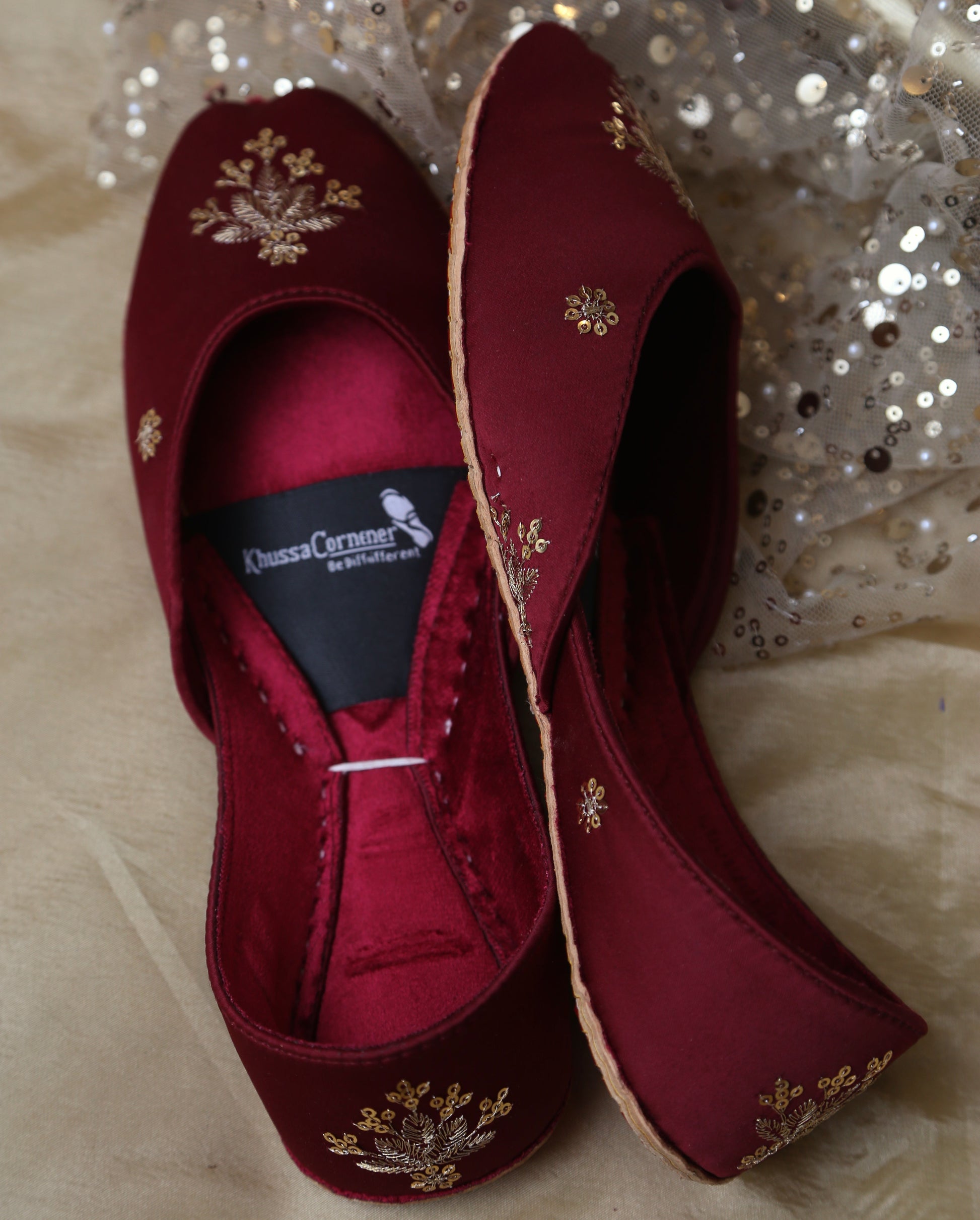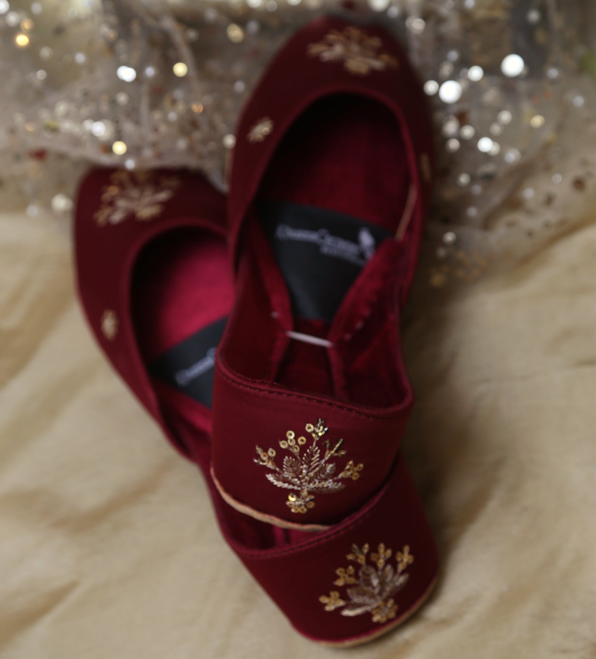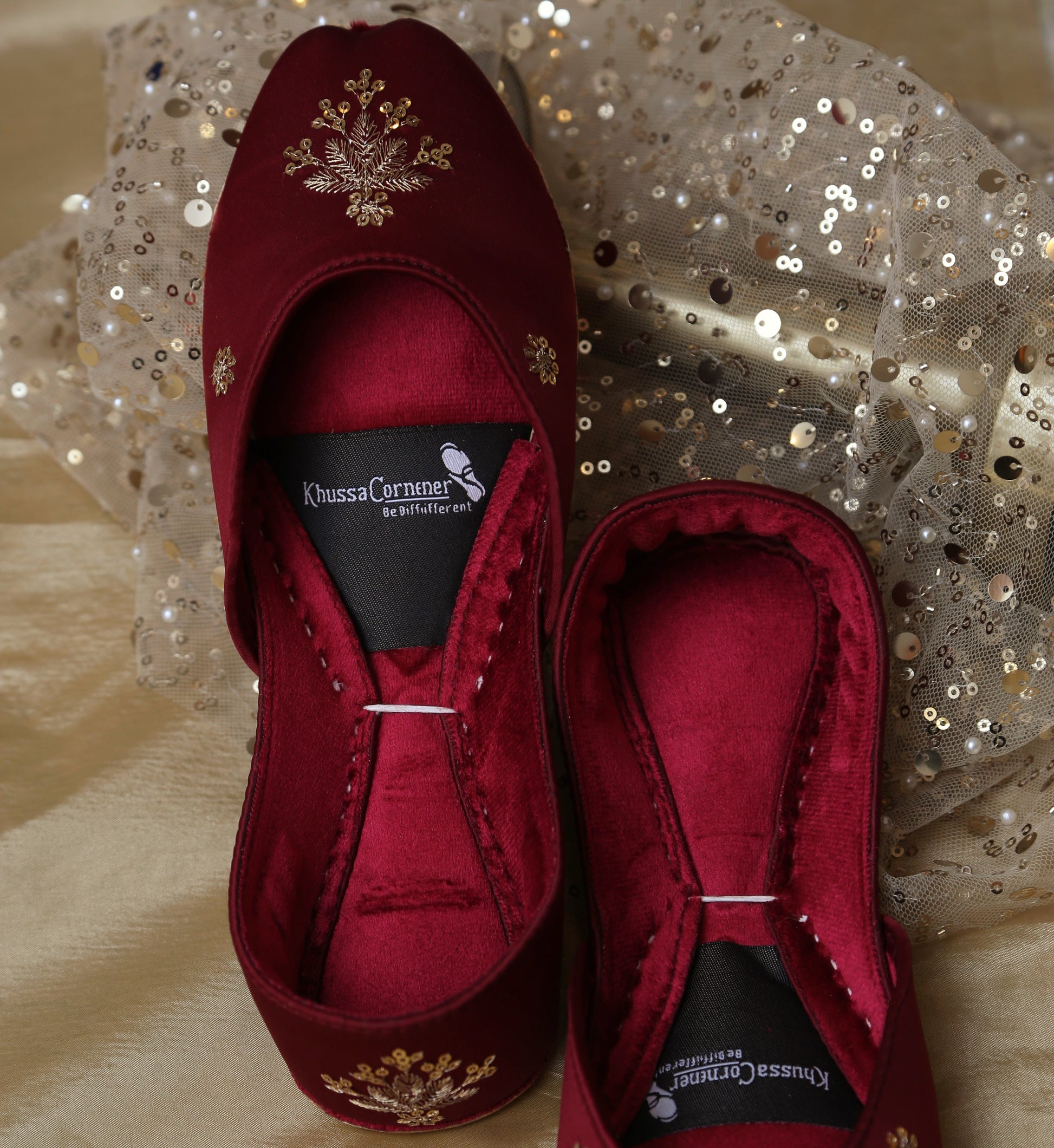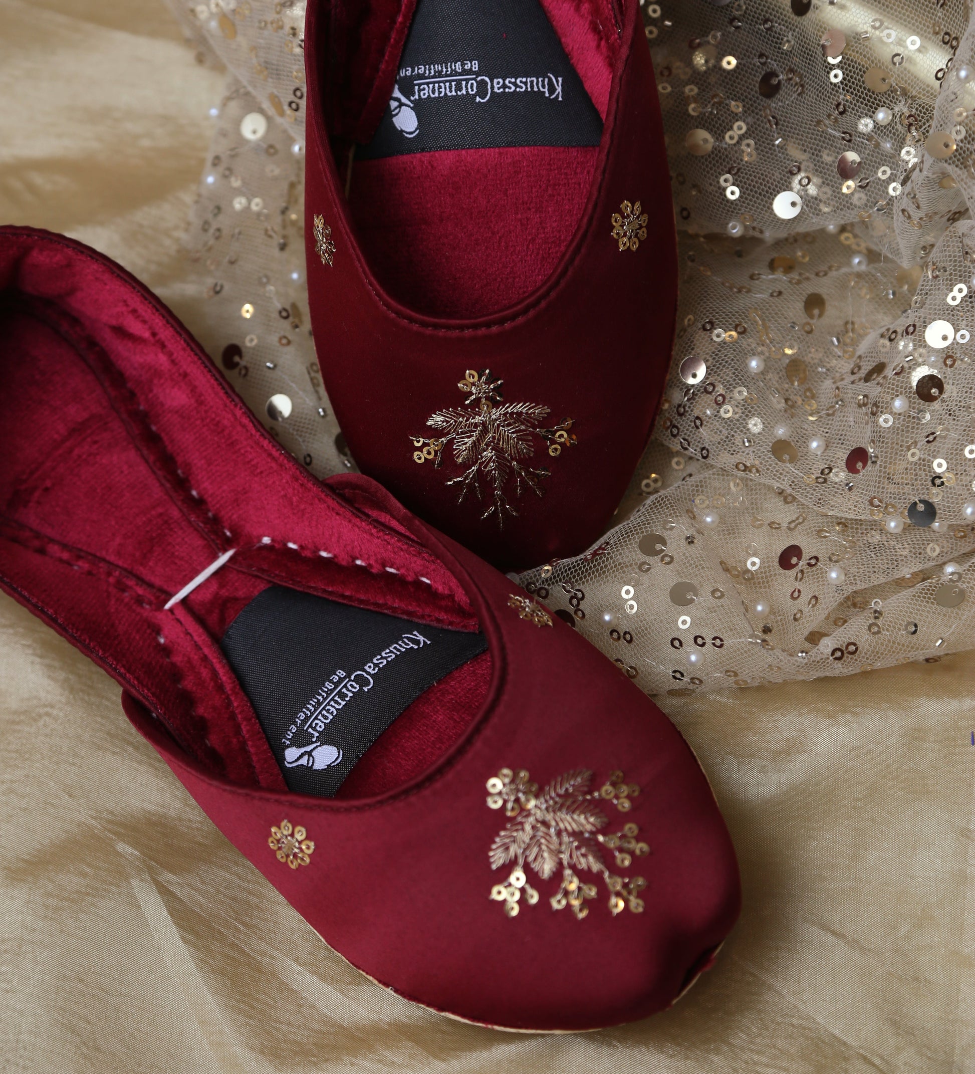Bold yet graceful, Zulekha Maroon Khussa is crafted for moments that call for richness and depth. The deep maroon tone enhances the gold embroidery, making it a perfect match for bridal wear, formal occasions, and festive evenings.